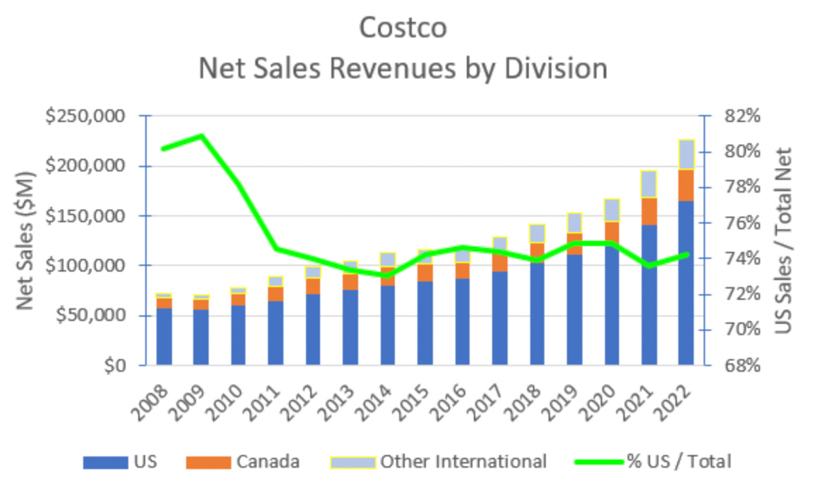 Taking a look at a graph that breaks down their revenue, it can be seen that most of it has been coming from America. I see this as a big problem as if there is a recession, most of their revenue is going to get wiped out. Many people considering investing in Costco due to the diverse locations they have around the world, however, USA stays the only country they are dominant in and rely on.