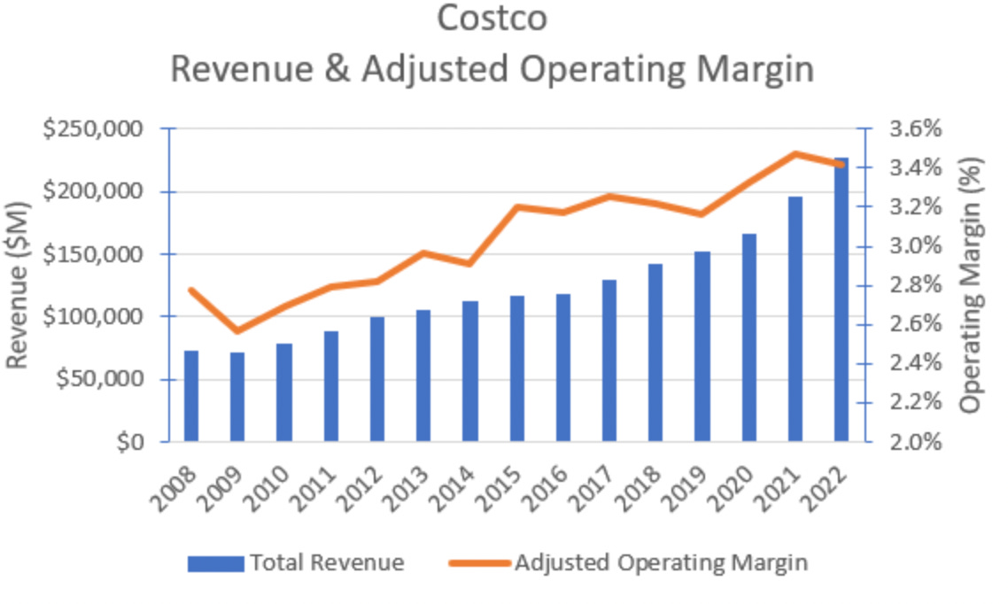 As seen by the chart above, revenues have been growing at over 8% compounding for the last 10 years with an even faster rate over the last 5 years. They were also not noticeably impacted by COVID. Unlike many other retailers, operating margins have been increasing every year for more than 10 years. These consistent results, even in unforeseen circumstances, make Costco a great pick for an investment considering the recession we are heading in