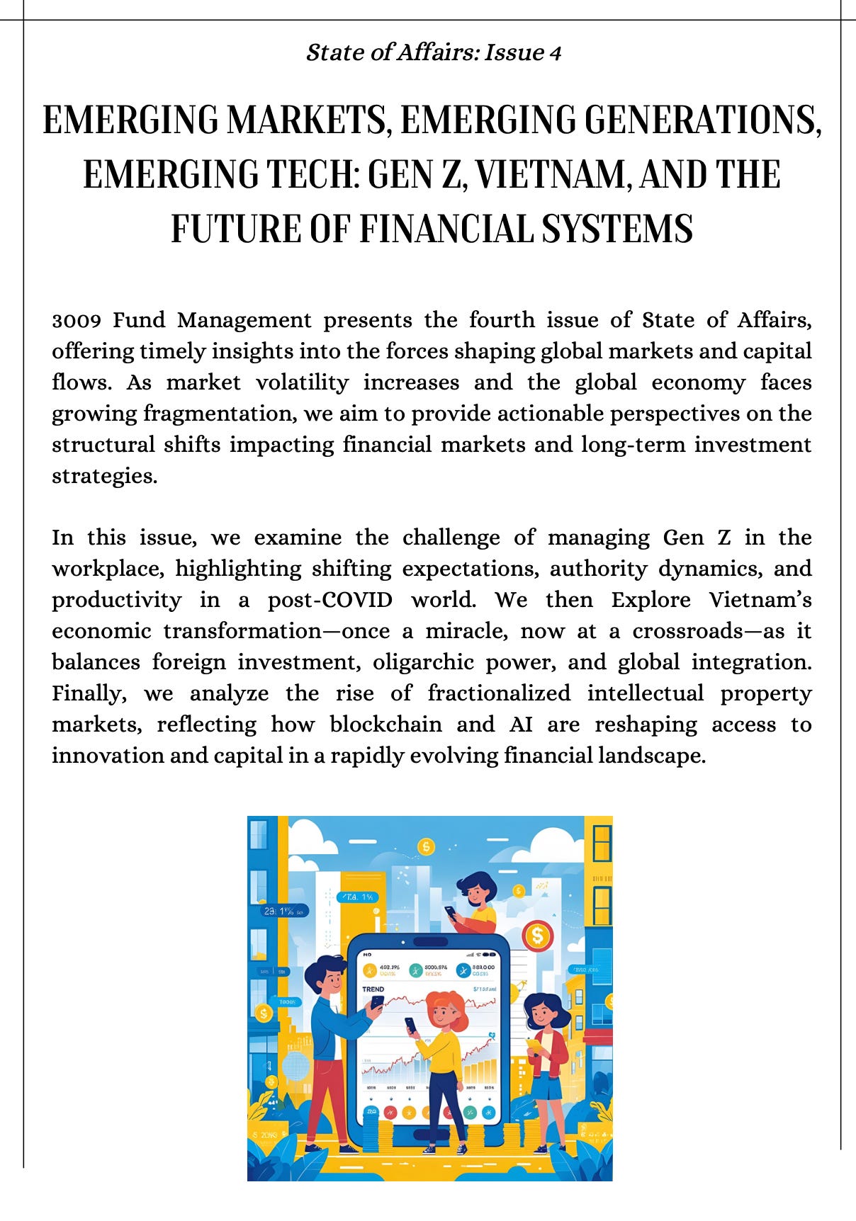 EMERGING MARKETS, EMERGING GENERATIONS, EMERGING TECH: GEN Z, VIETNAM, AND THE FUTURE OF FINANCIAL SYSTEMSState of Affairs: Issue 43009 Fund ManagementMay 30, 2025ShareWe’d be grateful if you subscribed. 3009 Substack offers original takes on global markets and the economy, not just recycled finance commentary. Each edition is the result of careful thought, and your support truly means a lot to us.SubscribeSoa 41.2MB ∙ PDF fileDownloadDownload