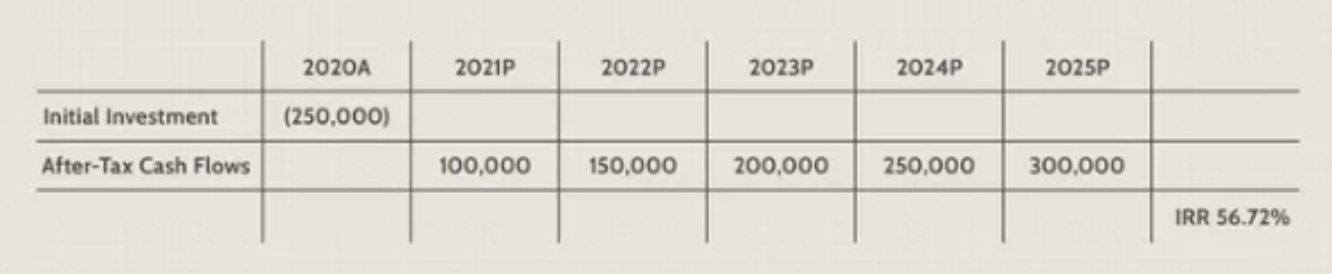 Here is a simple example of an IRR analysis with cash flows that are known for the next five years. This company is asking for an investment of 250,000 and in return, they are expected to generate 100,000 the next year and keep continuing to grow by 50,000 each for the next four years. The goal of an IRR is to calculate whether an investment into the company will be profitable or not or if the investor is getting a good deal on it. There are several other methods used in order to calculate a company's return, however, IRR is the most commonly used due to its accuracy. On the other hand, an investment will usually not have the same rate of return each year so even an IRR is sometimes not accurate. One of the most common uses of an IRR is to compare the profitability of newly founded projects and the already established ones. For example, an energy company may use IRR in order to decide whether they should open a new power plant or renovate and expand the one they already have based on the expected profits. While both projects may sound like a good idea, the IRR will identify which one can have the most expected profits. IRR is also a useful tool for corporations in deciding whether they should set buyback programs or not. By doing this, companies can figure out if buying back their own shares is the most profitable than any other use of the funds, such as expanding or acquiring other companies. Single individuals can also use IRR for their personal finances. For example, you can use IRR to evaluate different insurances based on the benefits that they have to offer. The cheaper the insurance is going to cost as compared to the benefits it has to offer, the better it will be. Generally speaking, any project with an IRR greater than its cost of capital should be profitable. In planning investment projects, firms will often require a rate of return (RRR) to determine the minimum acceptable return percentage. Any project with an IRR that is bigger than the RRR will likely be profitable, however, this isn’t the only criteria used to accept investments. What sets IRR apart from the compound annual growth rate (CAGR) is the fact that the CAGR measures the annual return on an investment over a period of time. The IRR is also an annual rate of return. However, the CAGR typically uses only a beginning and ending value to provide an estimated annual rate of return. IRR on the other hand involves using multiple periodic cash flows reflecting that cash inflows and outflows often constantly occur when it comes to investments, therefore, having a more accurate result. Companies and analysts may also look at the return on investment (ROI) when making financial decisions. ROI tells an investor about the total growth from the start to the finish of the investment and not the yearly returns. IRR tells the investor what the annual growth rate is. The two numbers normally would be the same over the course of one year but won’t be the same for longer periods of time. while IRR is a very popular strategy used for estimating a project’s annual return. It is usually not intended to be used alone. The IRR itself is only a single estimated figure that provides an annual return value based on estimates. Since estimates in IRR can differ drastically from actual results, most analysts will also use other techniques used to calculate profits in addition to IRR.