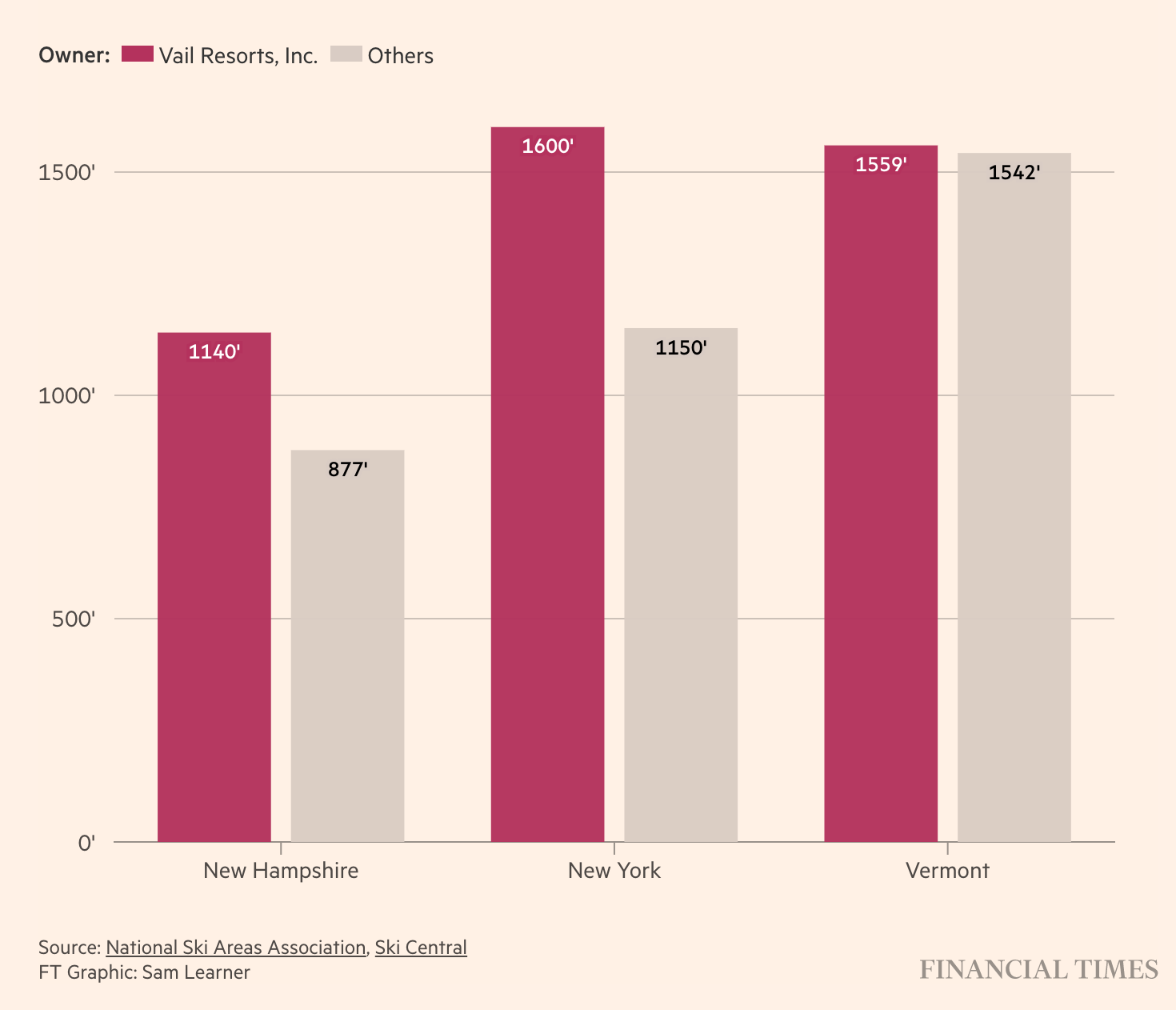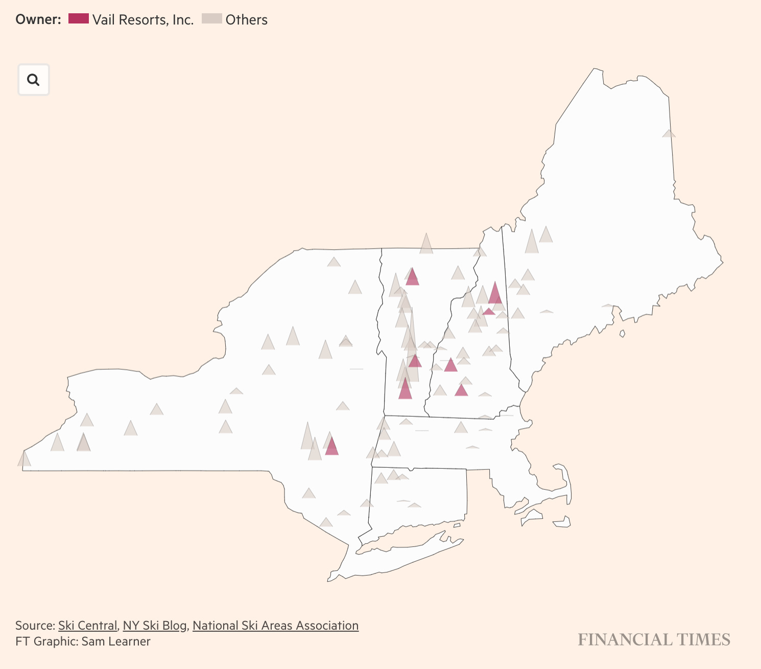 The company’s expansion in the northeast of the US, where it owns 94 ski lifts versus 41 for its nearest competitor, Boyne USA, is part of a strategy to turn these resorts into feeder destinations. The idea is that visitors to ski areas in New York and Vermont will become customers for its larger resorts in the west, including the eponymous Vail and Breckenridge in Colorado and Park City in Utah.